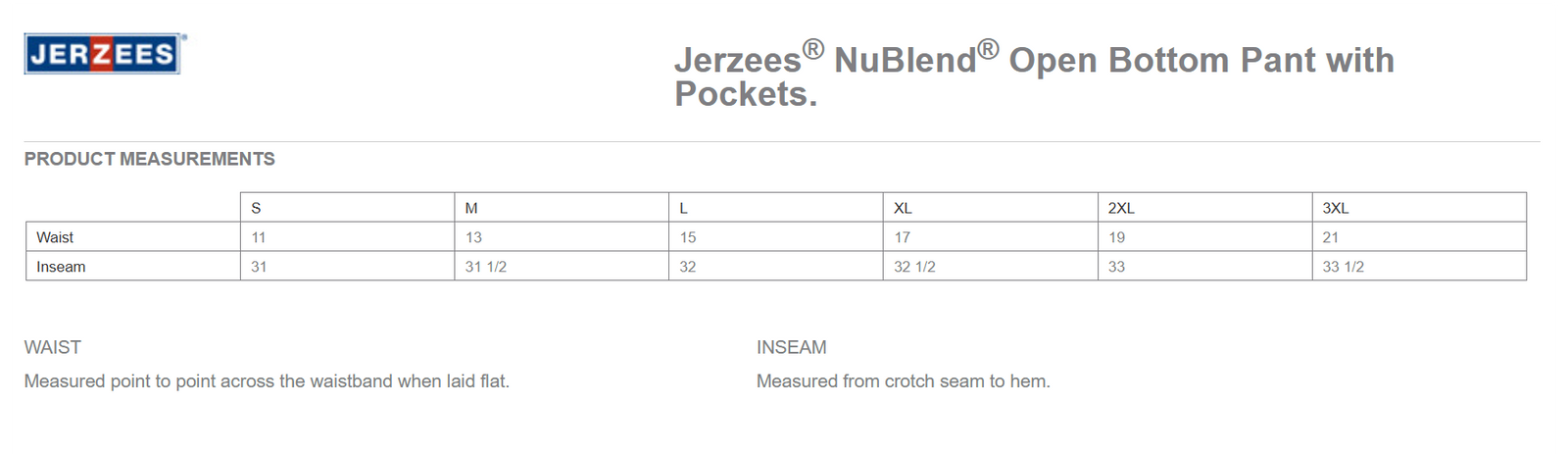 8 oz., 50/50 cotton/poly Nublend® pill-resistant fleece. Side entry pockets and open bottom with double-needle hem. Triple needle covered elastic waistband with inside drawcord.